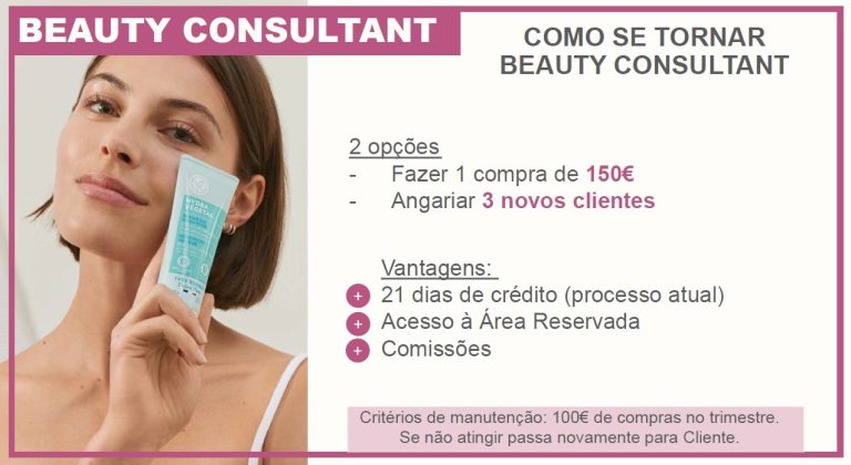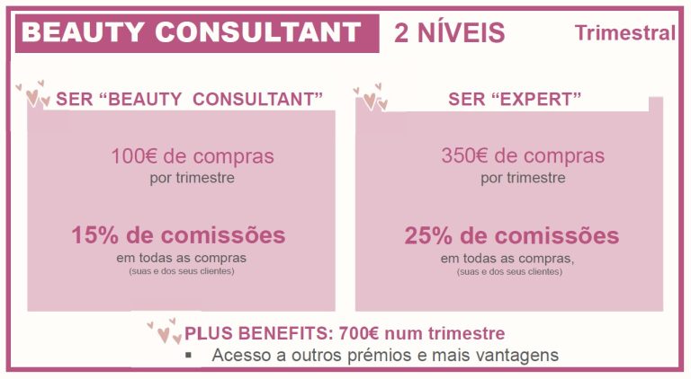 Se as suas vendas durante (3) meses forem de 100€ em valor acumulado, vai ser uma Beauty Consultant e os seus lucros durante esse trimestre vão ser de 15% nas suas encomendas acima dos 35€ e vai ter a oferta dos portes.